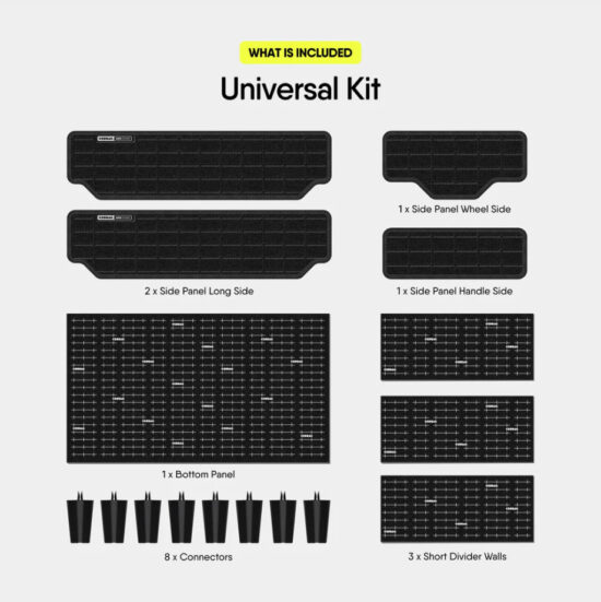 The GRID-DIVIDE Carry-On Universal Kit features laser-cut hook-and-loop panels, Nylex-coated EVA walls that can be used straight or curved, and patented hook-and-loop connectors that allow for endless reconfiguration. Designed to work seamlessly with the GRID LID and CRDPOUCH series.
