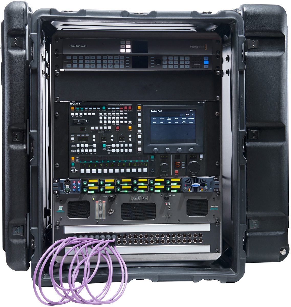 All Rack Mount Cases include several standard features such as a water and airtight seal using a tongue-and-groove closure and patented metal mounting points that distribute the load across the walls for maximum integrity.