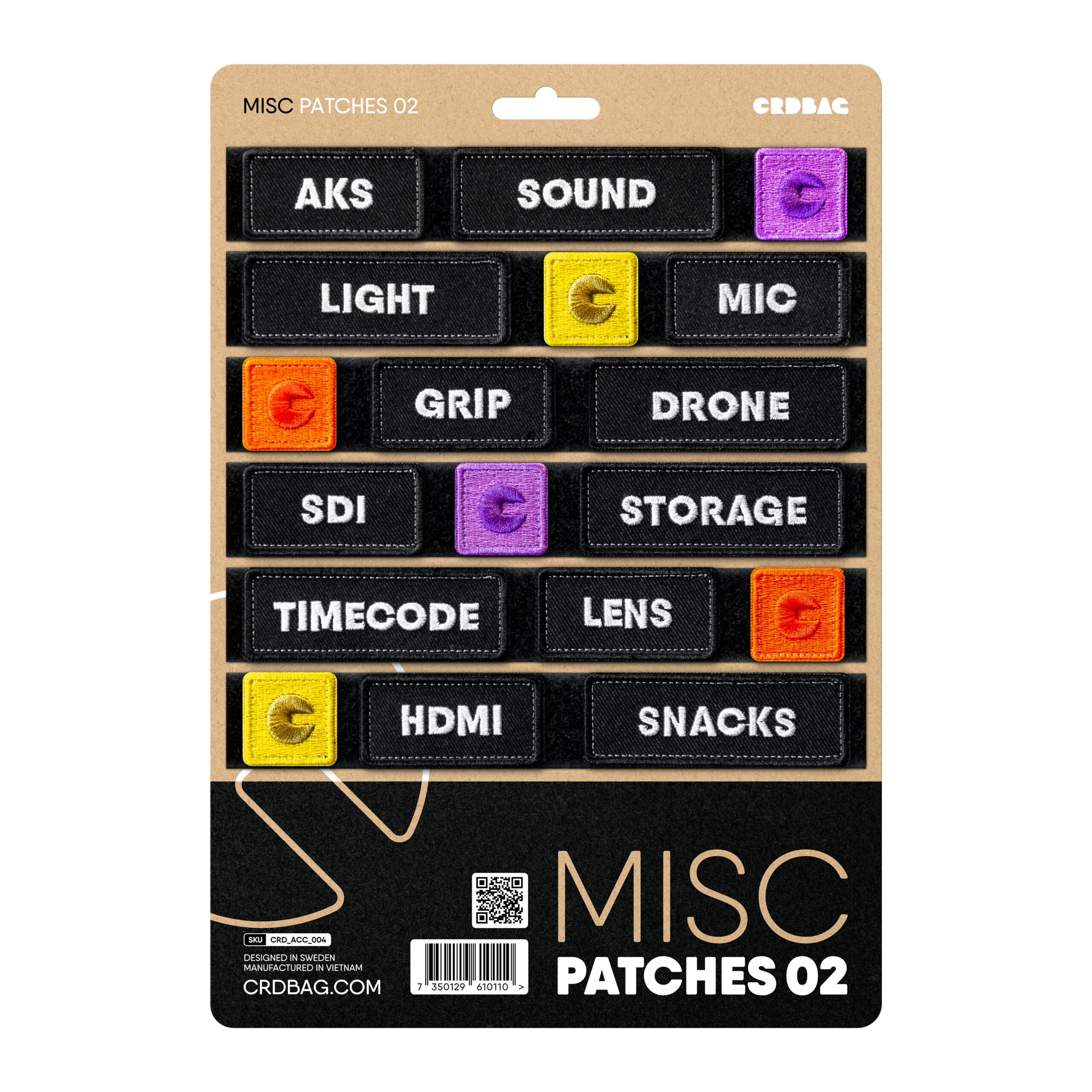 – Patches: AKS, SOUND, LIGHT, MIC, GRIP, DRONE, SDI, STORAGE, TIMECODE, LENS, HDMI, SNACKS, 3 x ORANGE ICON, 3 x YELLOW ICON, 3 x PURPLE ICON