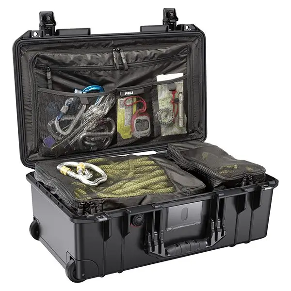 Stop met zoeken in oude bagage bij de incheckbalie of in afgelegen basiskampen en reis slimmer met Peli™ Air Travel Cases. De deksels hebben vakken met ritssluiting voor het opbergen van grotere spullen en doorzichtige gaasvakken voor paspoorten en kabels.
